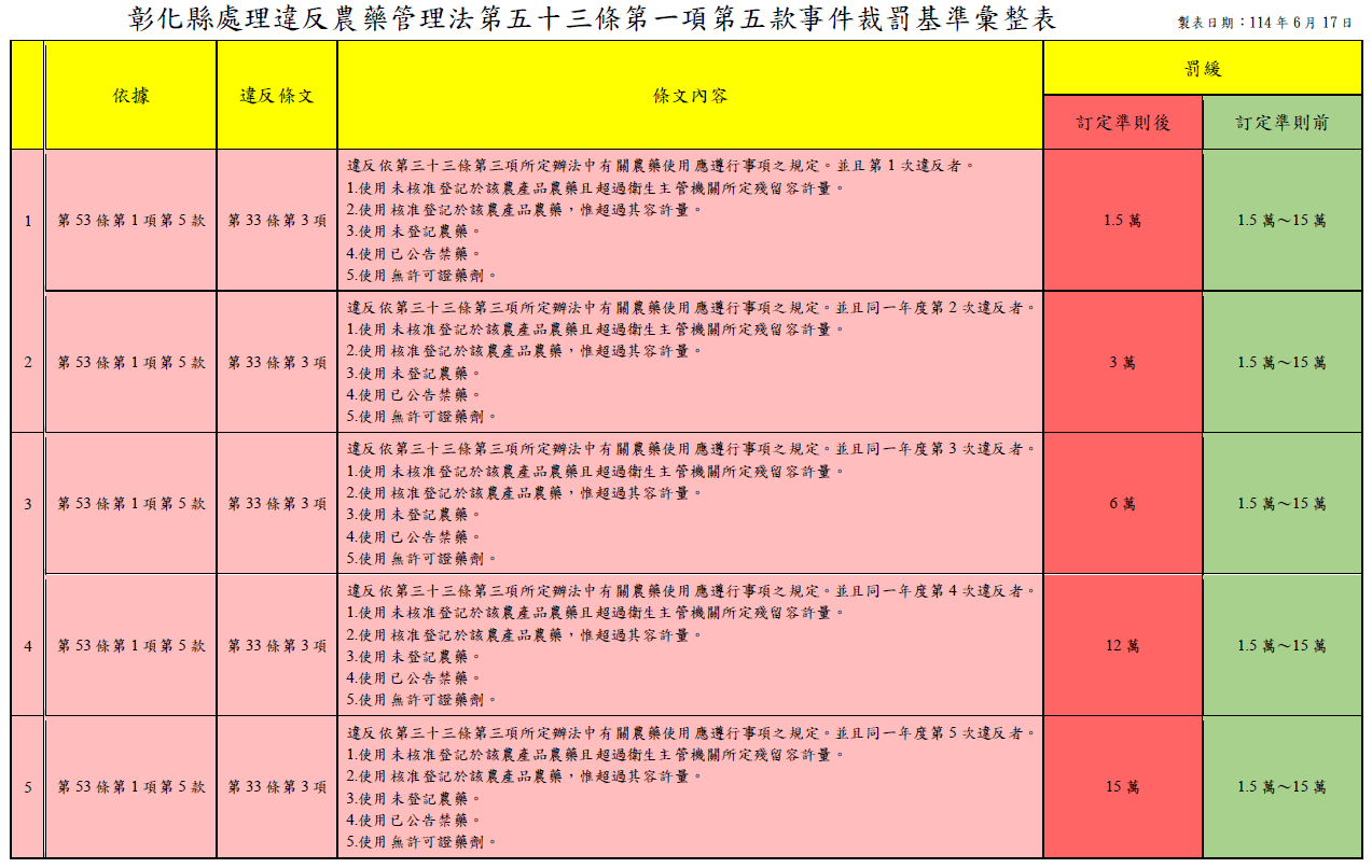 68_彰化縣處理違反農藥管理法第五十三條第一項第五款事件裁罰基準彙整表.pdf