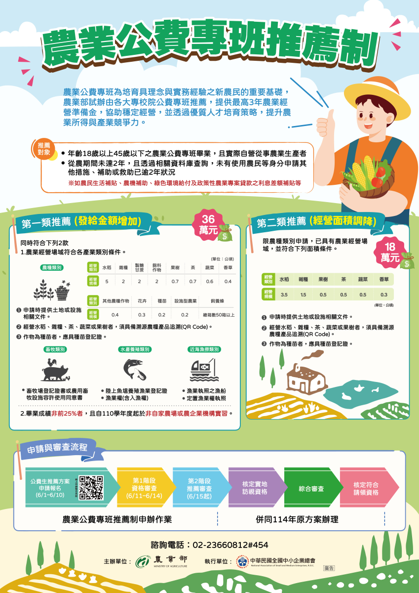 一、農業公費專班係新農民培育之重要基礎工作,為規劃完整之農業人才培育藍圖,本部將試辦農業公費專班之大專校院推薦畢業生申請農業經營準備金(下稱公費生推薦方